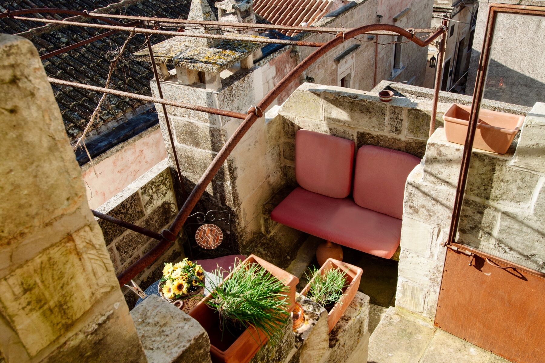 Die Ferienwohnung Ada gehört zu den eindrucksvollsten Dimora Martano-Wohnungen. Mit viel Liebe restauriert, verfügt sie über den besonderen Charme, den nur ein Domizil mit einer intensiven Geschichte zu bieten hat. Über eine steile Steintreppe erreicht man diese besonders schöne Ferienwohnung Studio Ada. Sie ist groß und hell, ausgestattet mit einem Himmelbett, einem Bad mit einer Dusche, die in den Stein gemeißelt wurde, sowie mit einer Küchenzeile. Über das Treppenhaus gelangen Sie von der Wohnung aus zu einer Panoramaterrasse mit herrlichem Blick auf die Altstadt von Maratano.